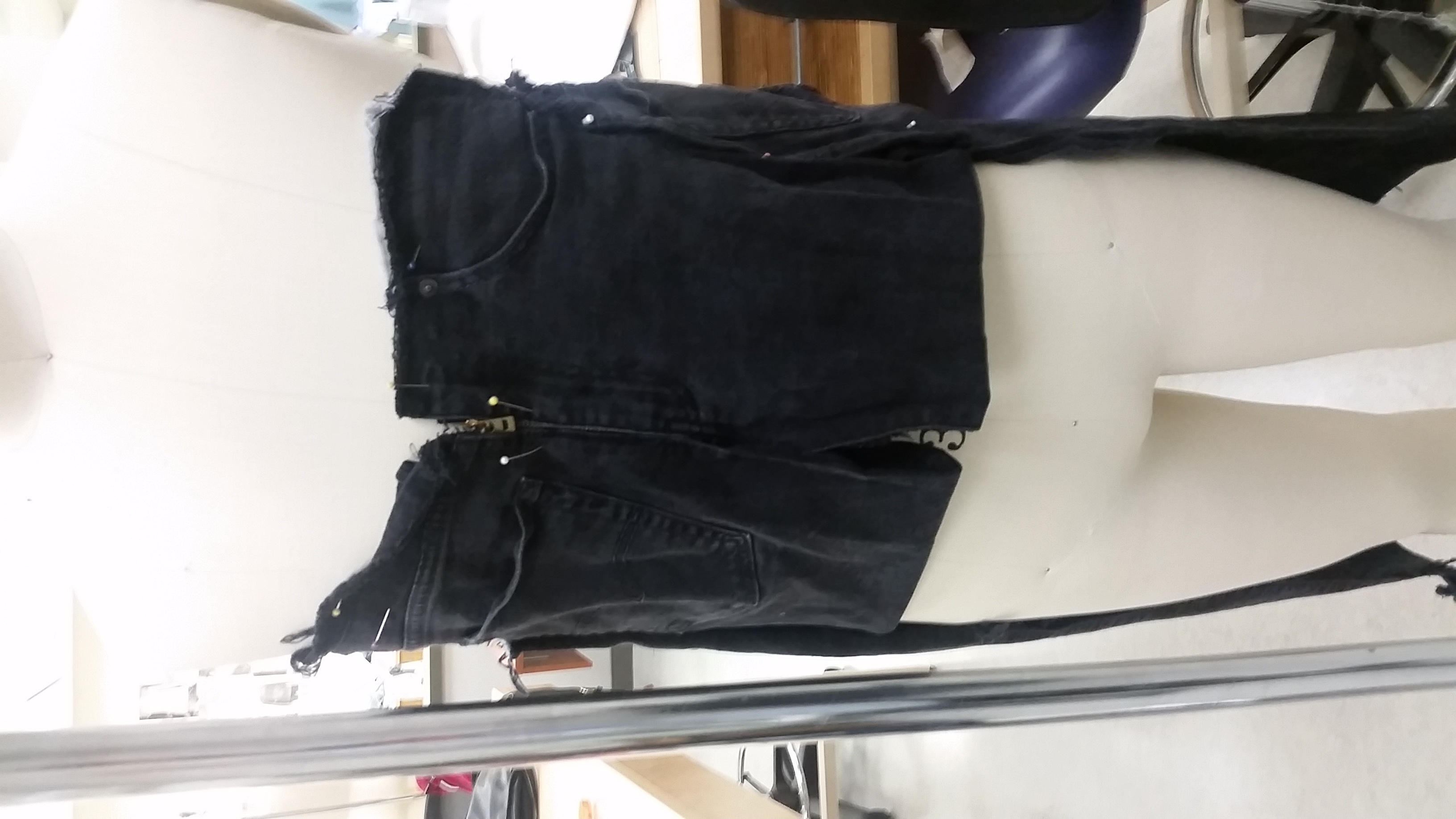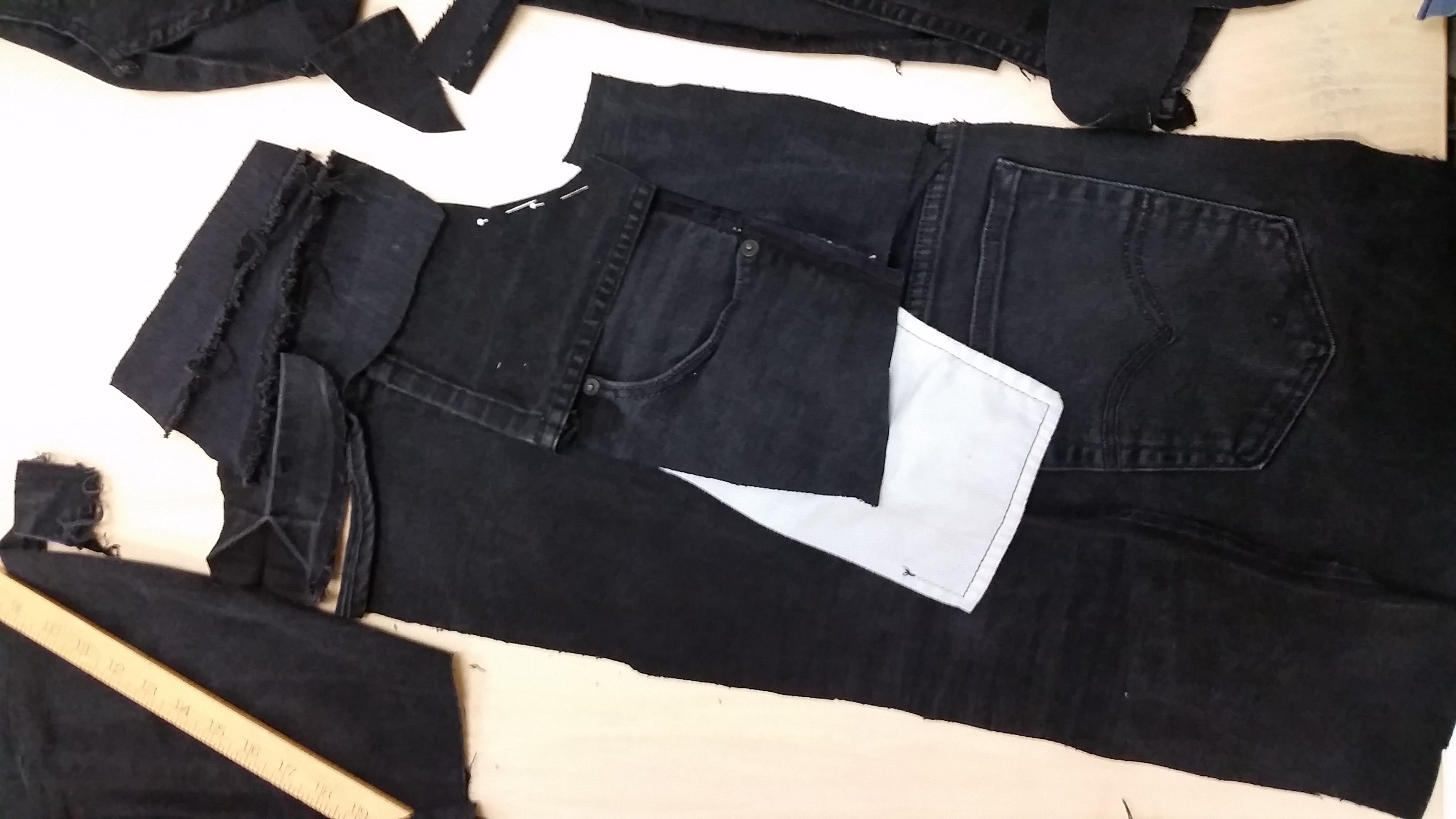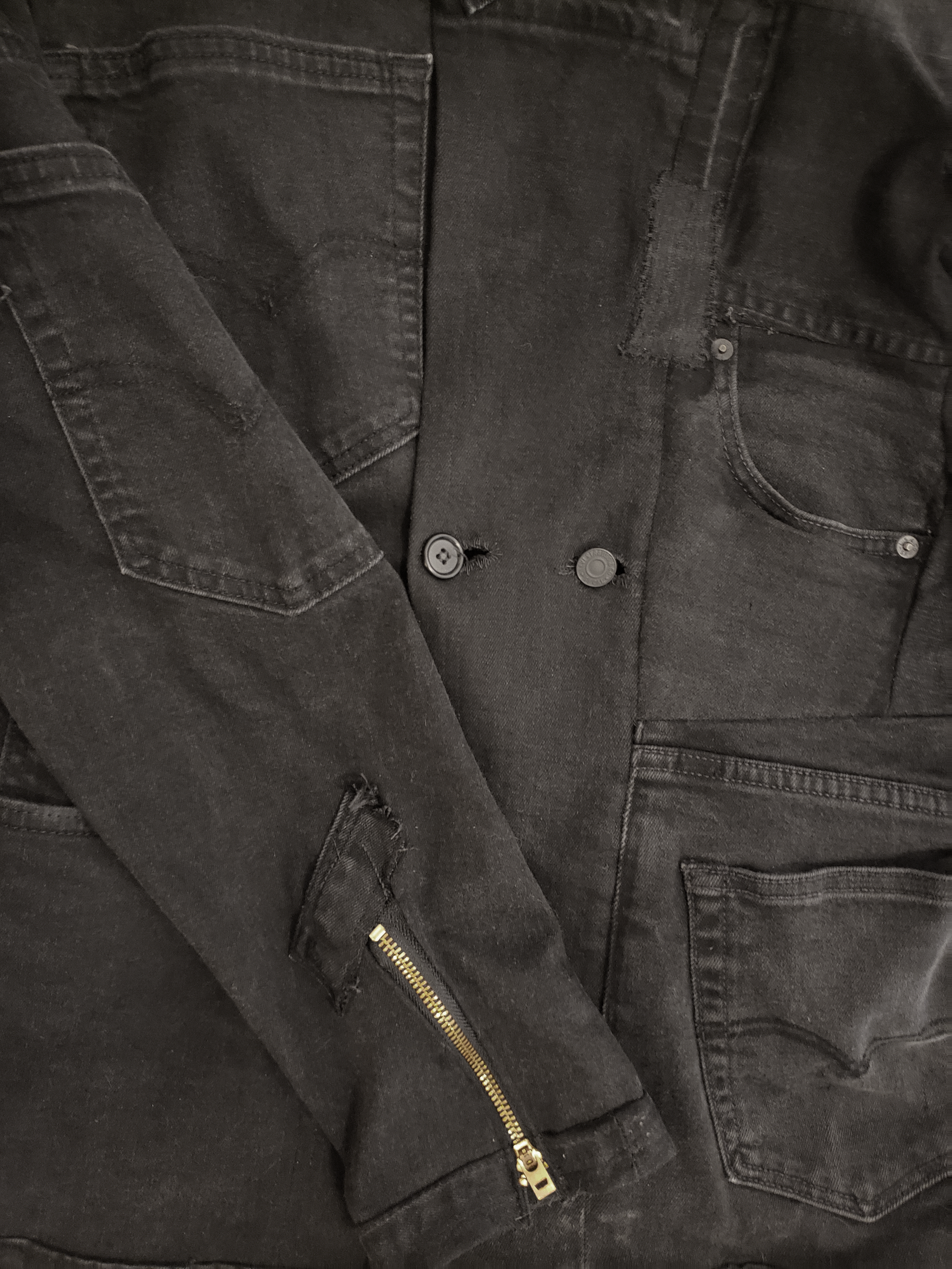 I began by taking apart each pair of jeans meticulously and deliberately, taking the time to undo each seam. Some components were kept attached, like the pockets. I knew I wanted to place those in an asymmetrical fashion along the face of the garment, to create a chaotic appearance.