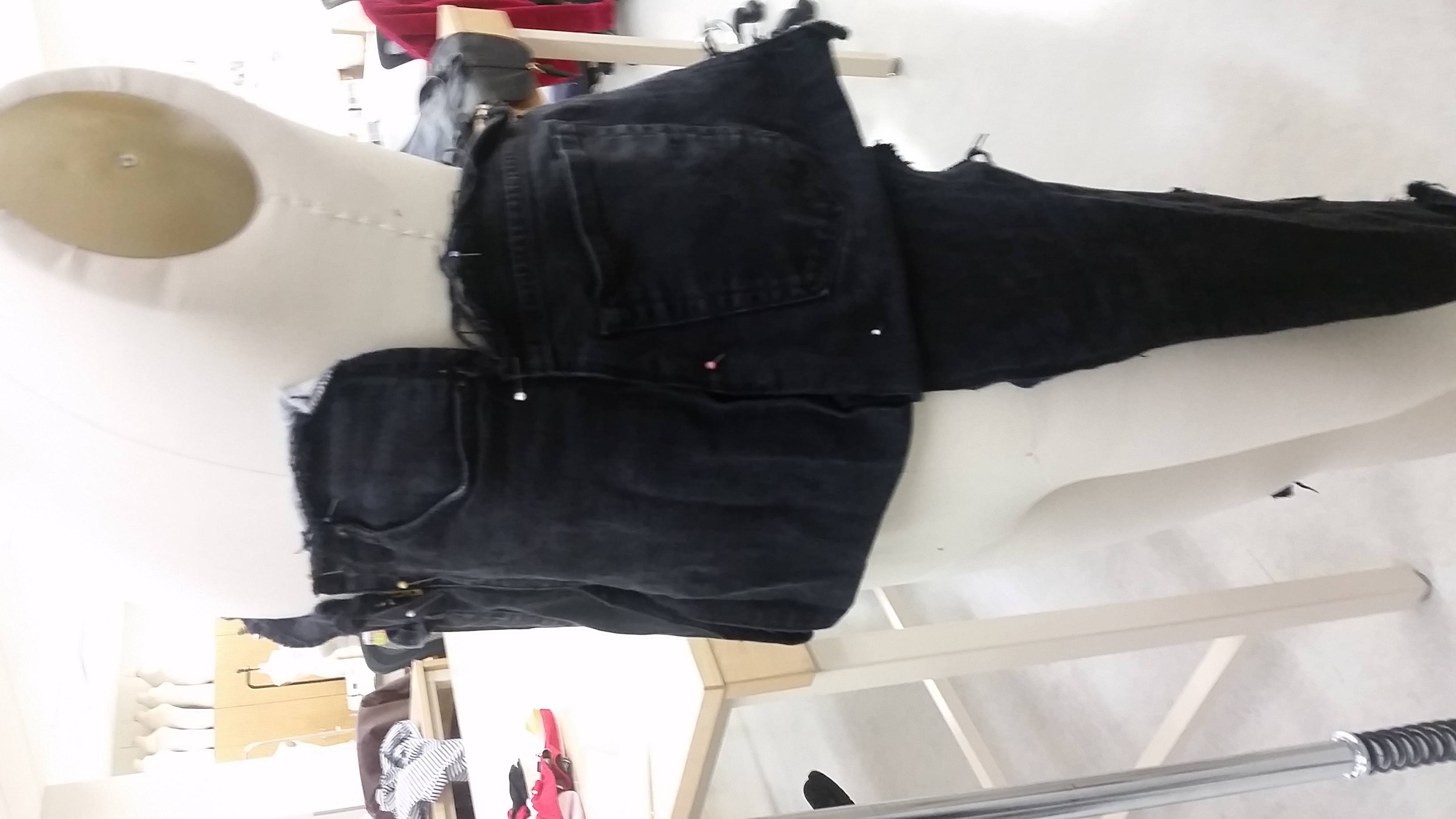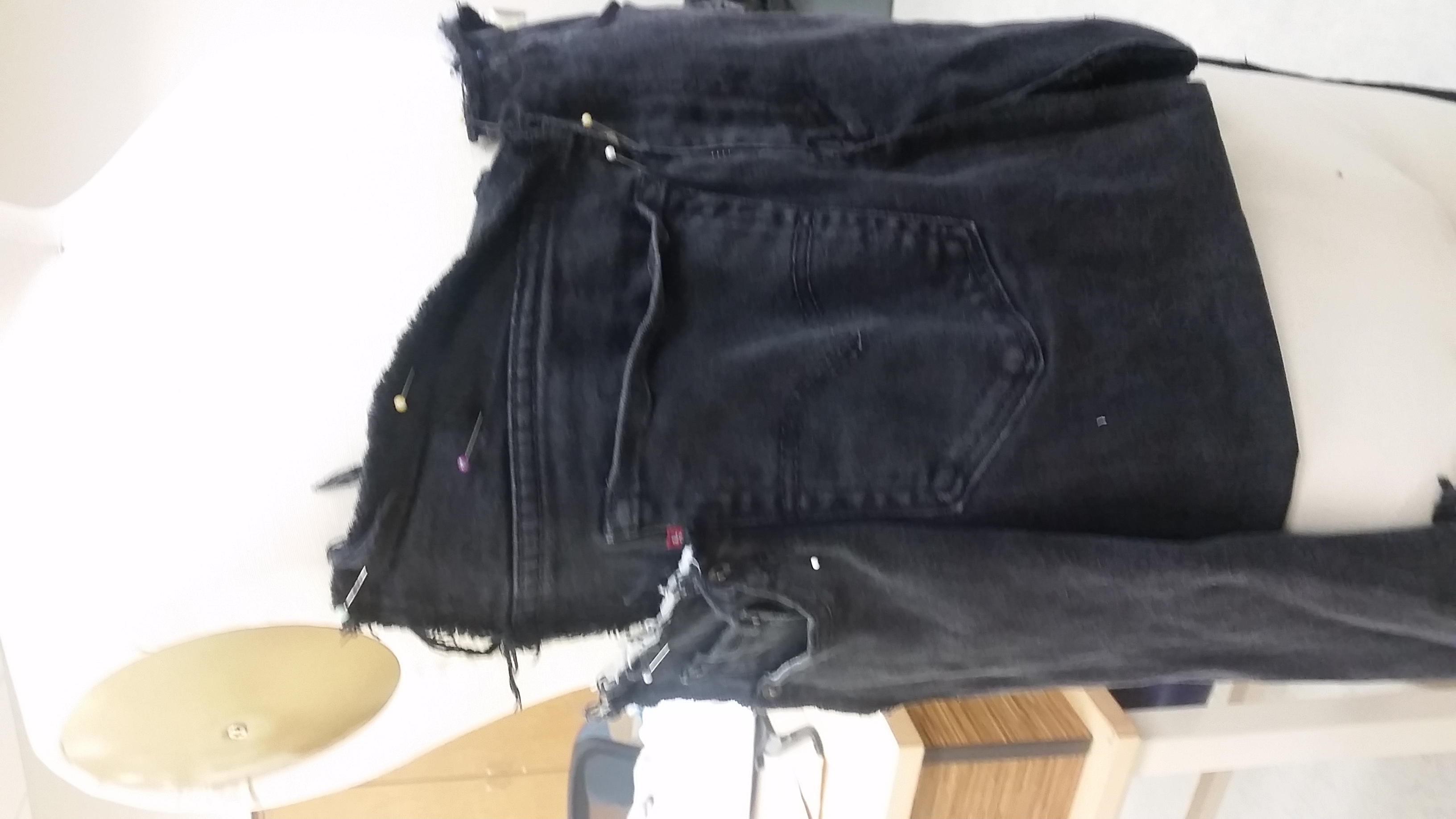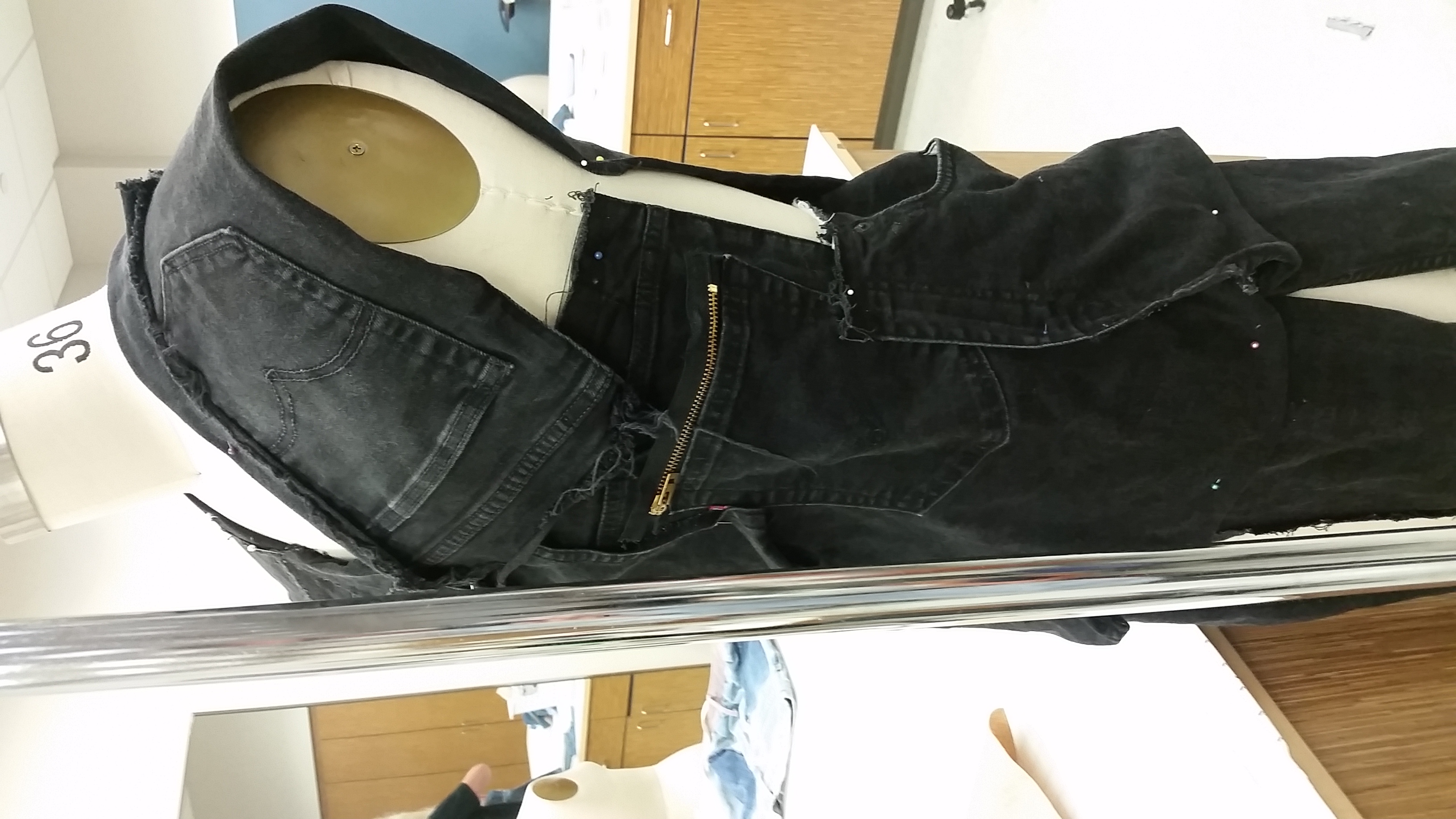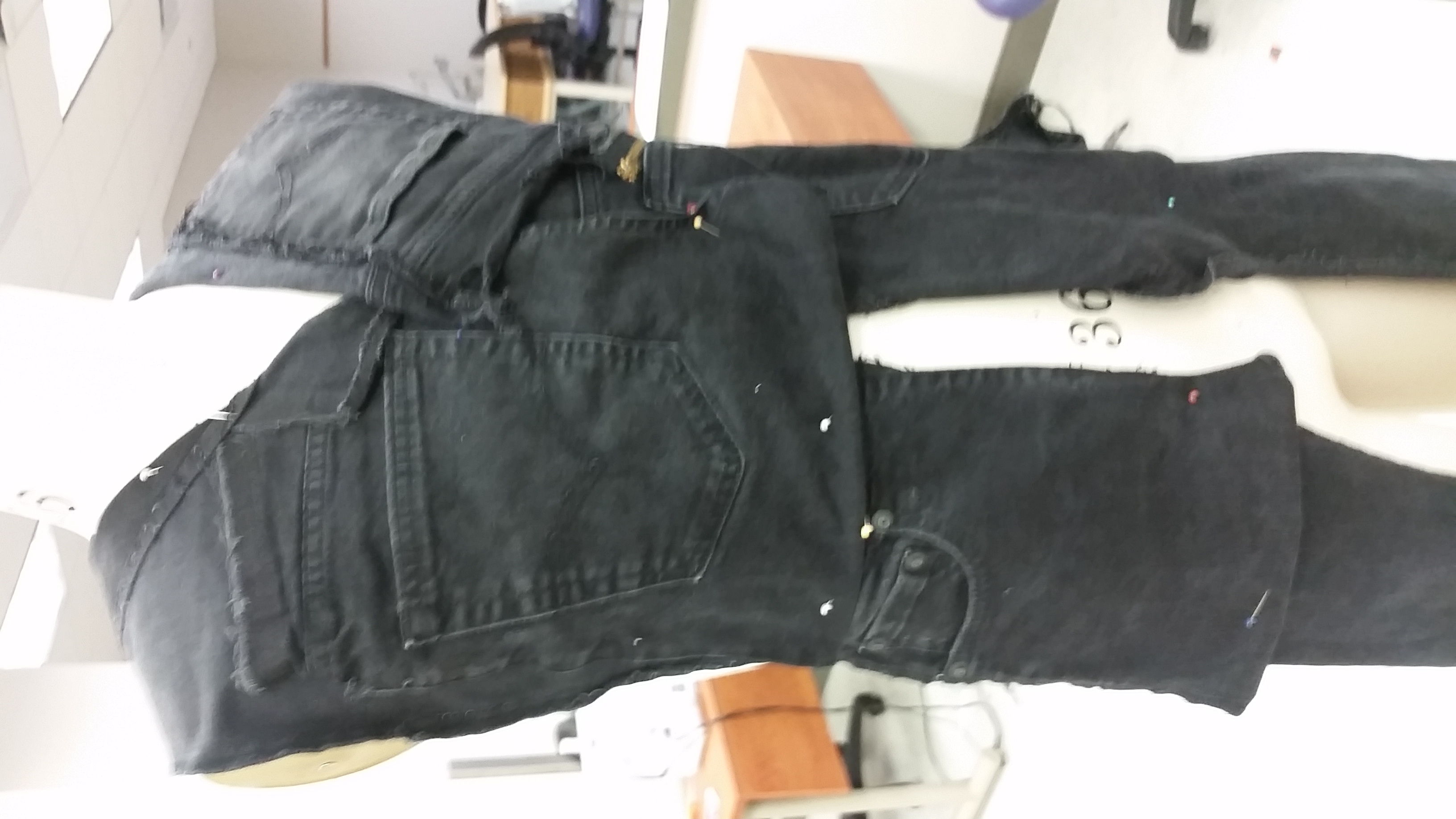 I began by taking apart each pair of jeans meticulously and deliberately, taking the time to undo each seam. Some components were kept attached, like the pockets. I knew I wanted to place those in an asymmetrical fashion along the face of the garment, to create a chaotic appearance.