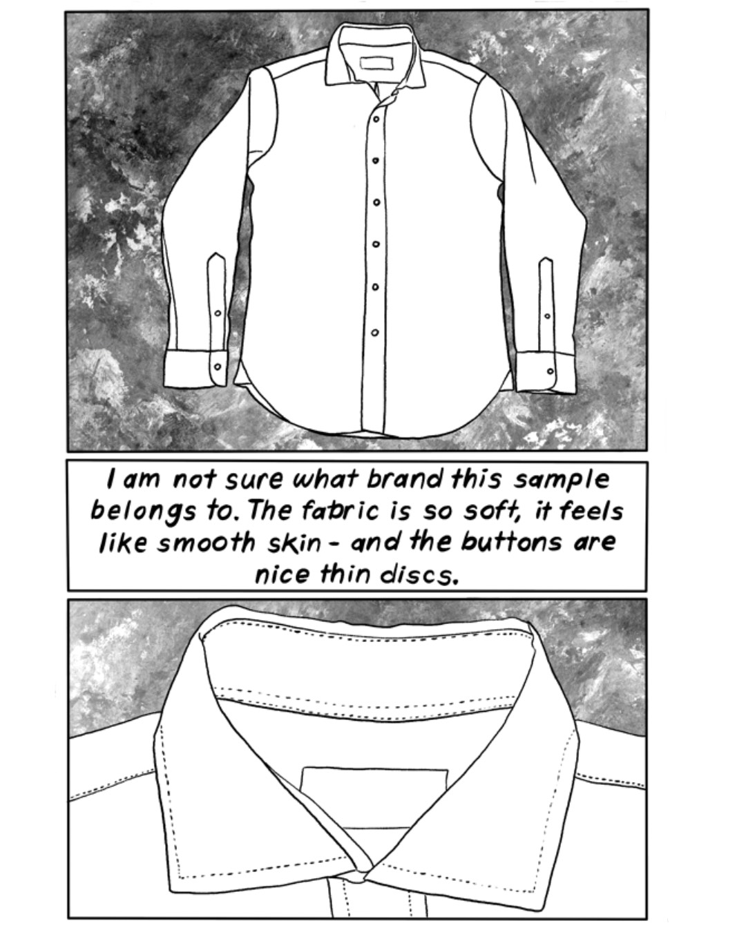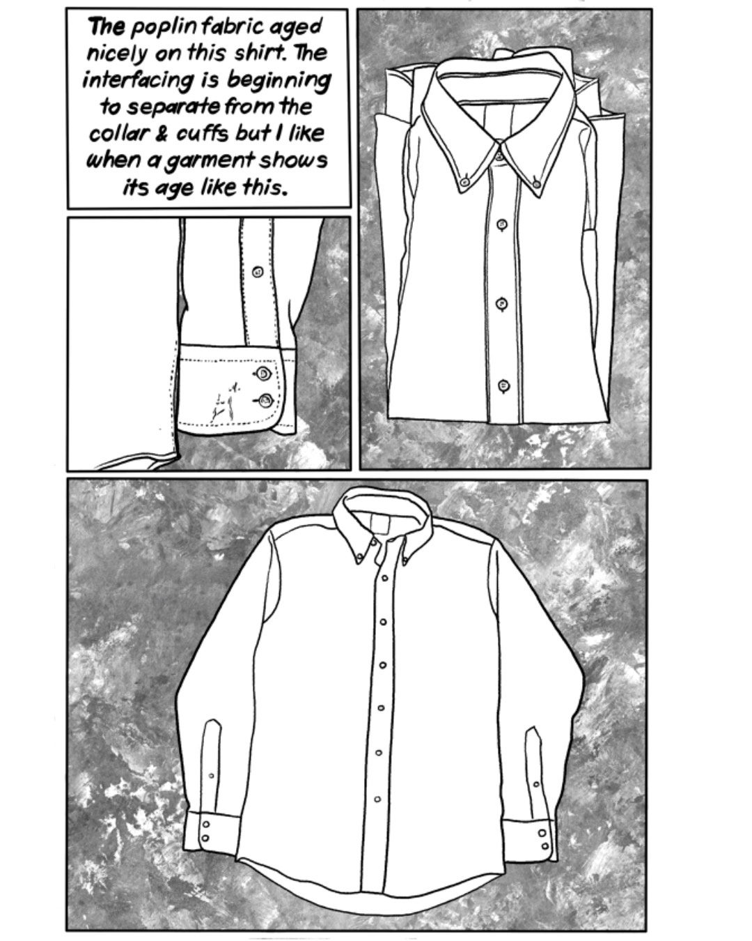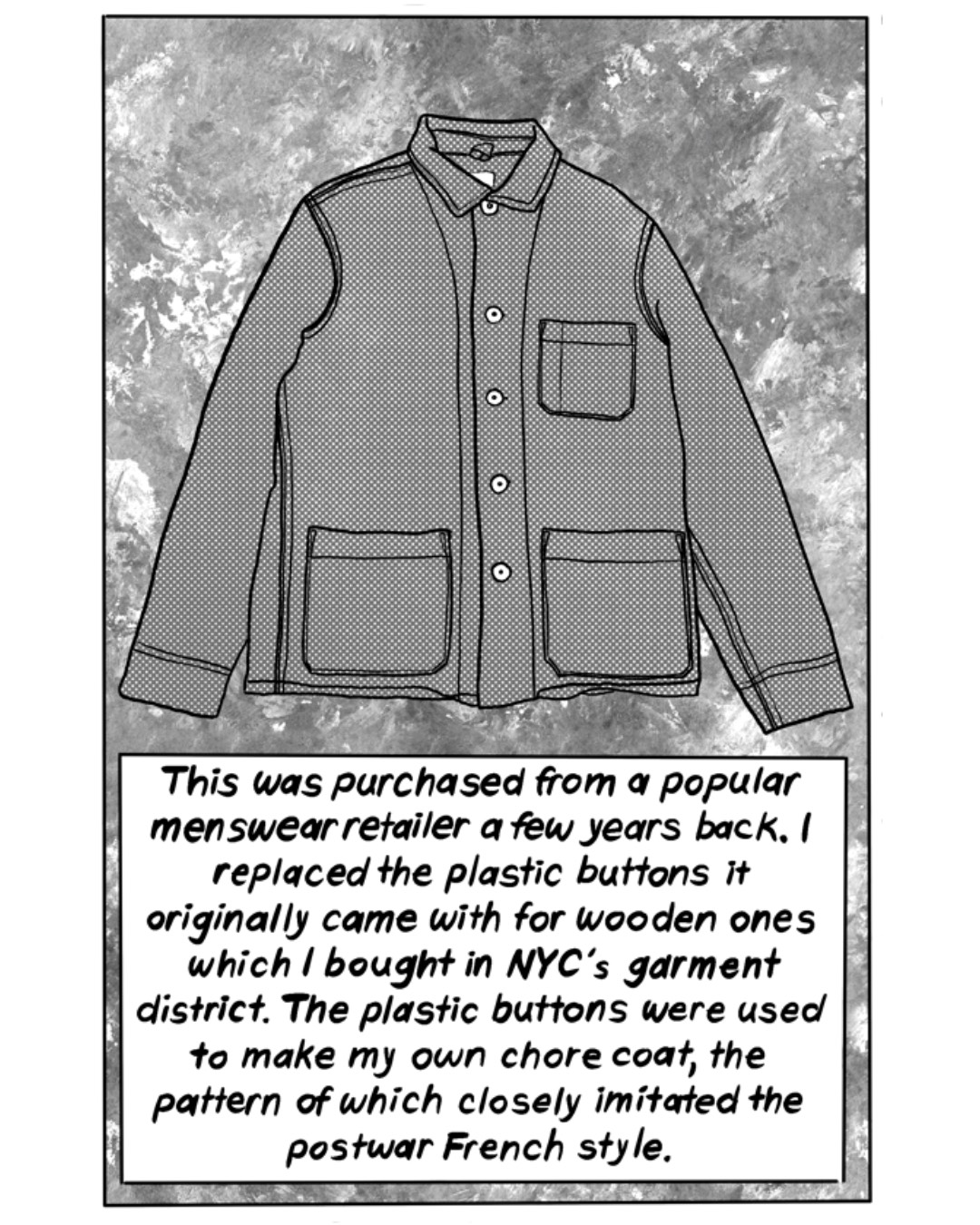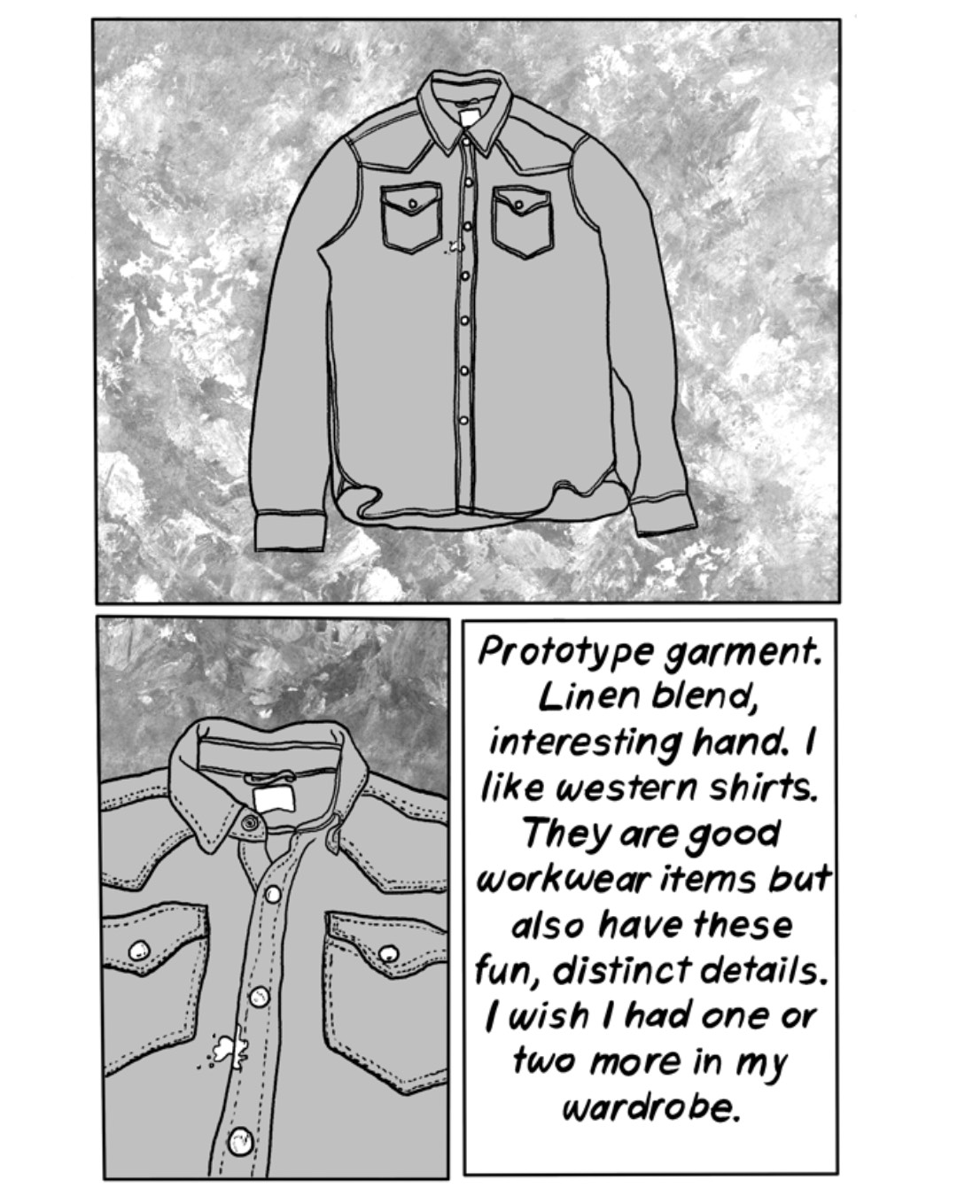 I had the idea during quarantine to create a small comic about certain clothes from my wardrobe. I selected a range of shirts and jackets and decided to write a few words about them, as well as produce a detailed flat of each garment.