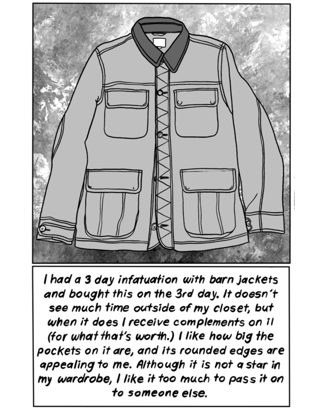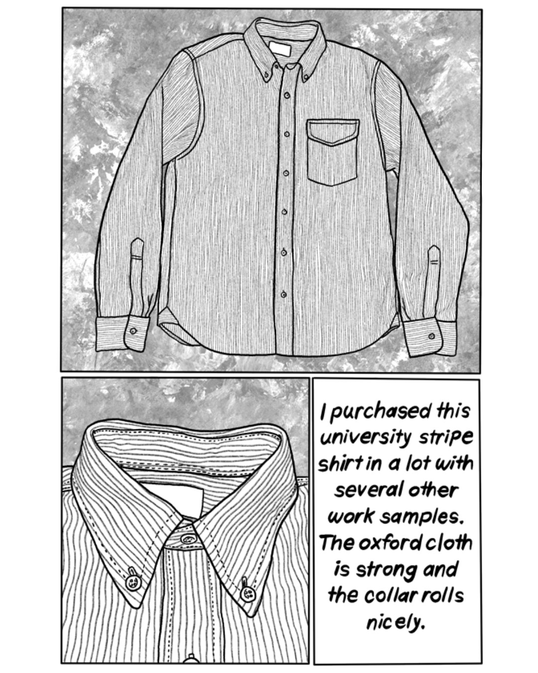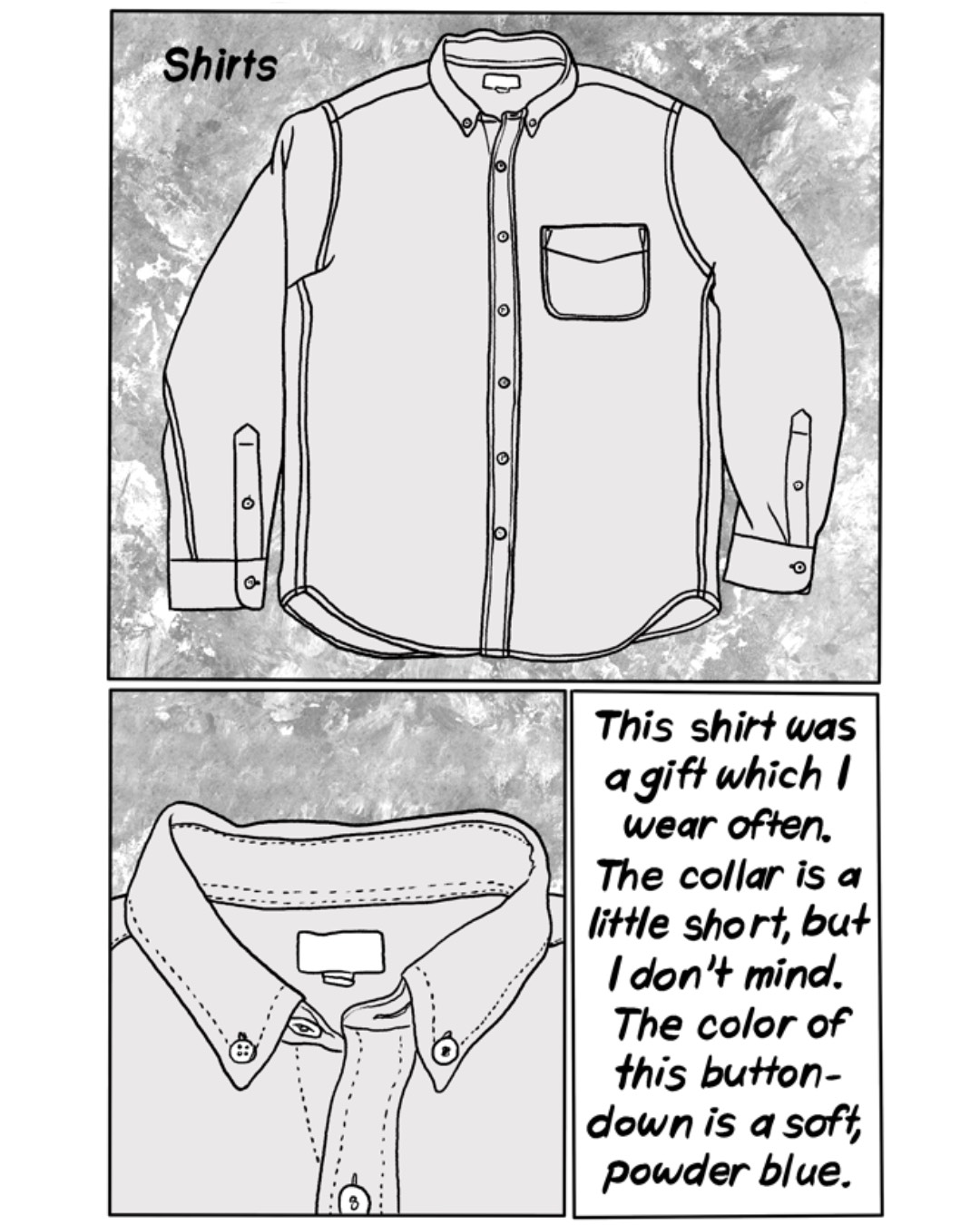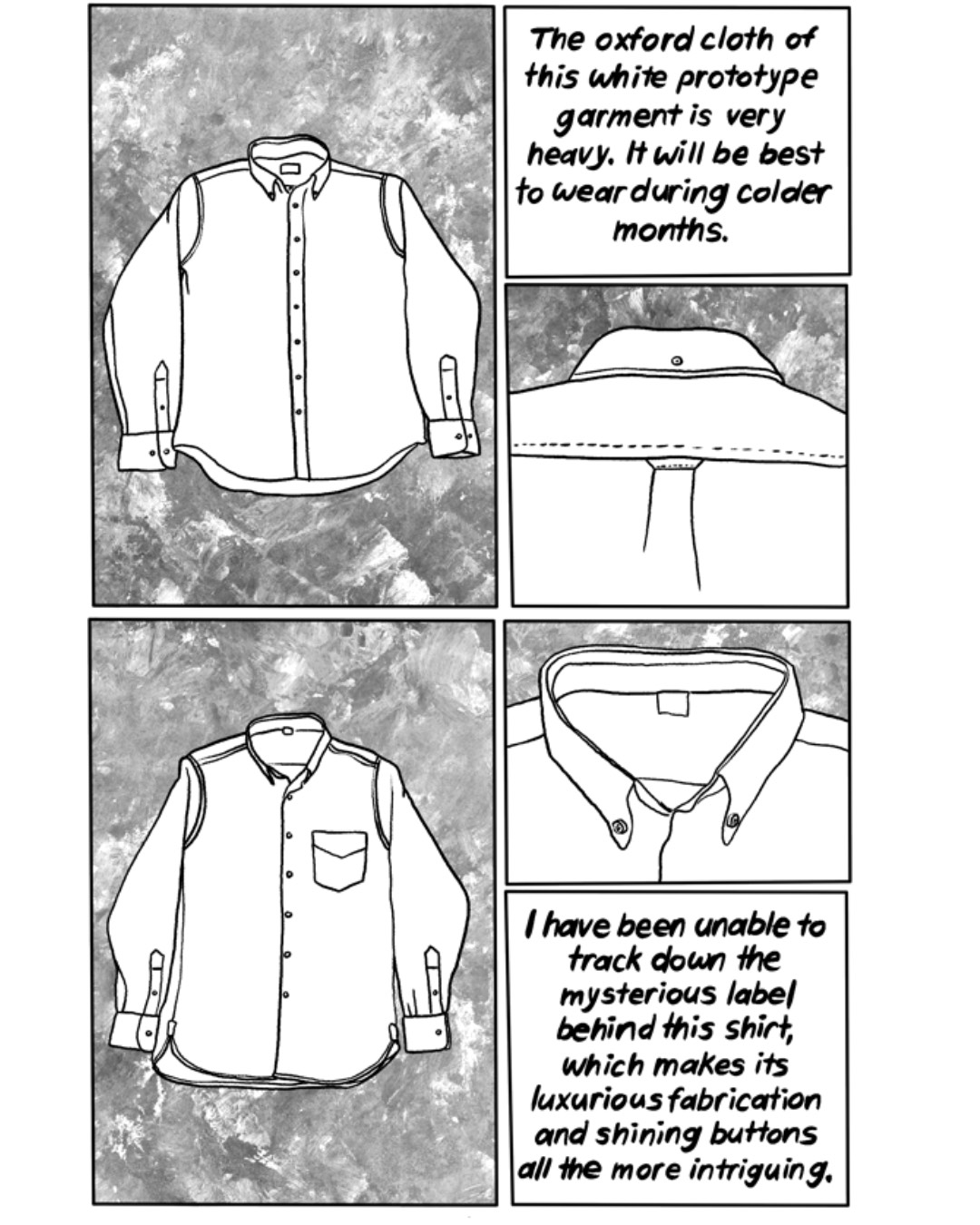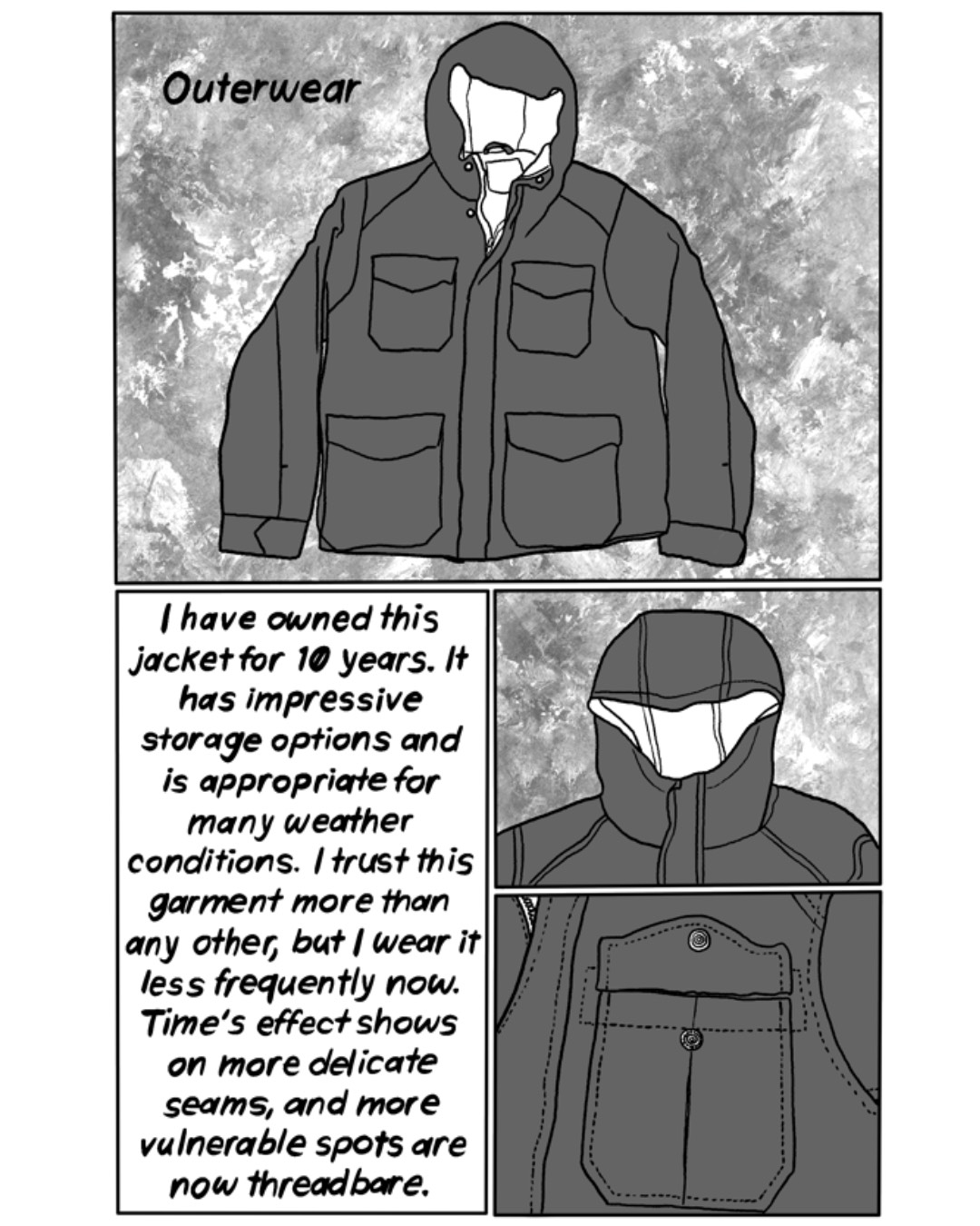 I had the idea during quarantine to create a small comic about certain clothes from my wardrobe. I selected a range of shirts and jackets and decided to write a few words about them, as well as produce a detailed flat of each garment.